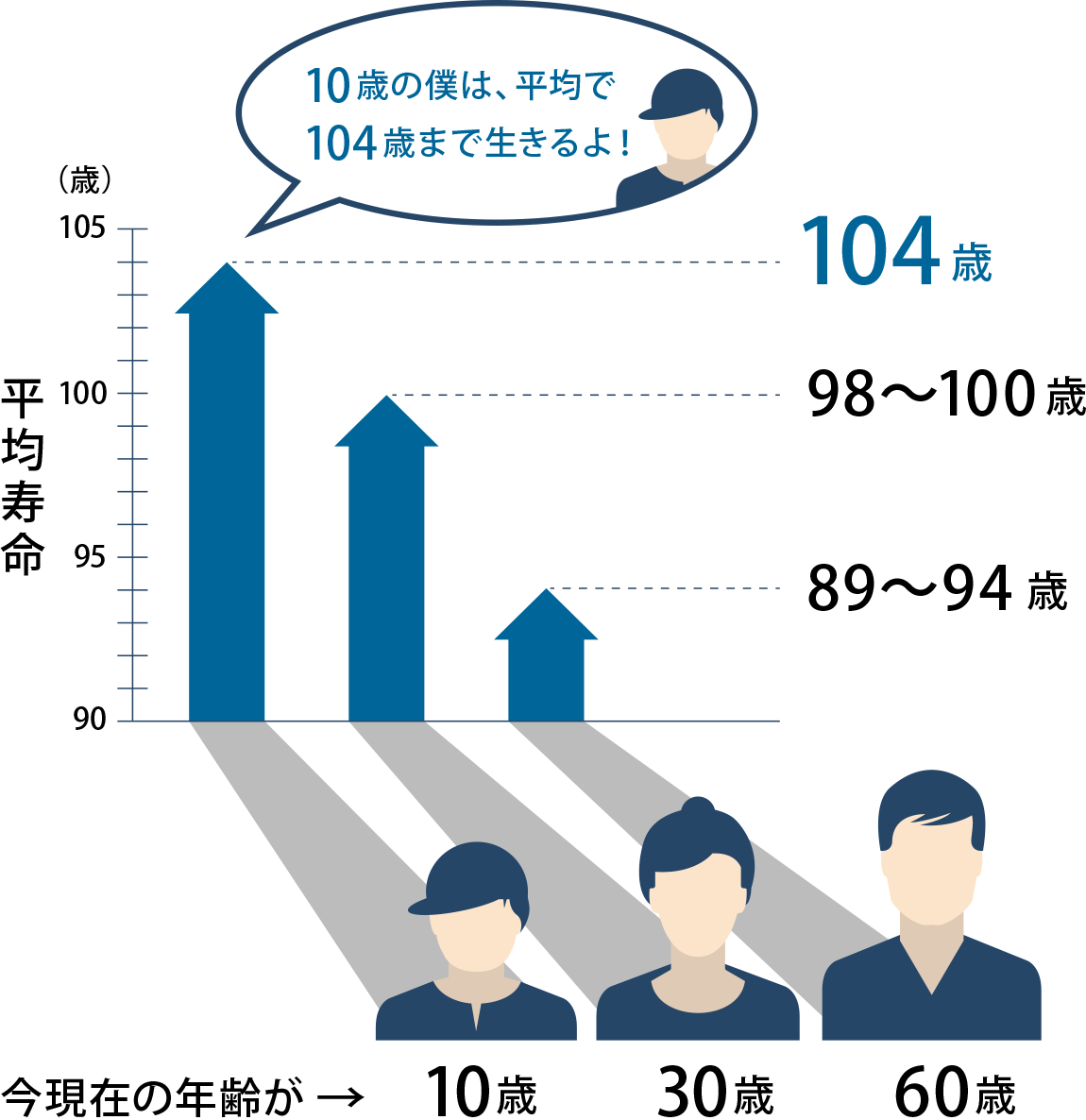 かつて、100歳以上まで生きることはとても珍しいことでした。しかし、「人生100年時代」と言われる今、60歳以下の人の平均寿命*は、100歳近く、または100歳以上となるとの試算もあります。