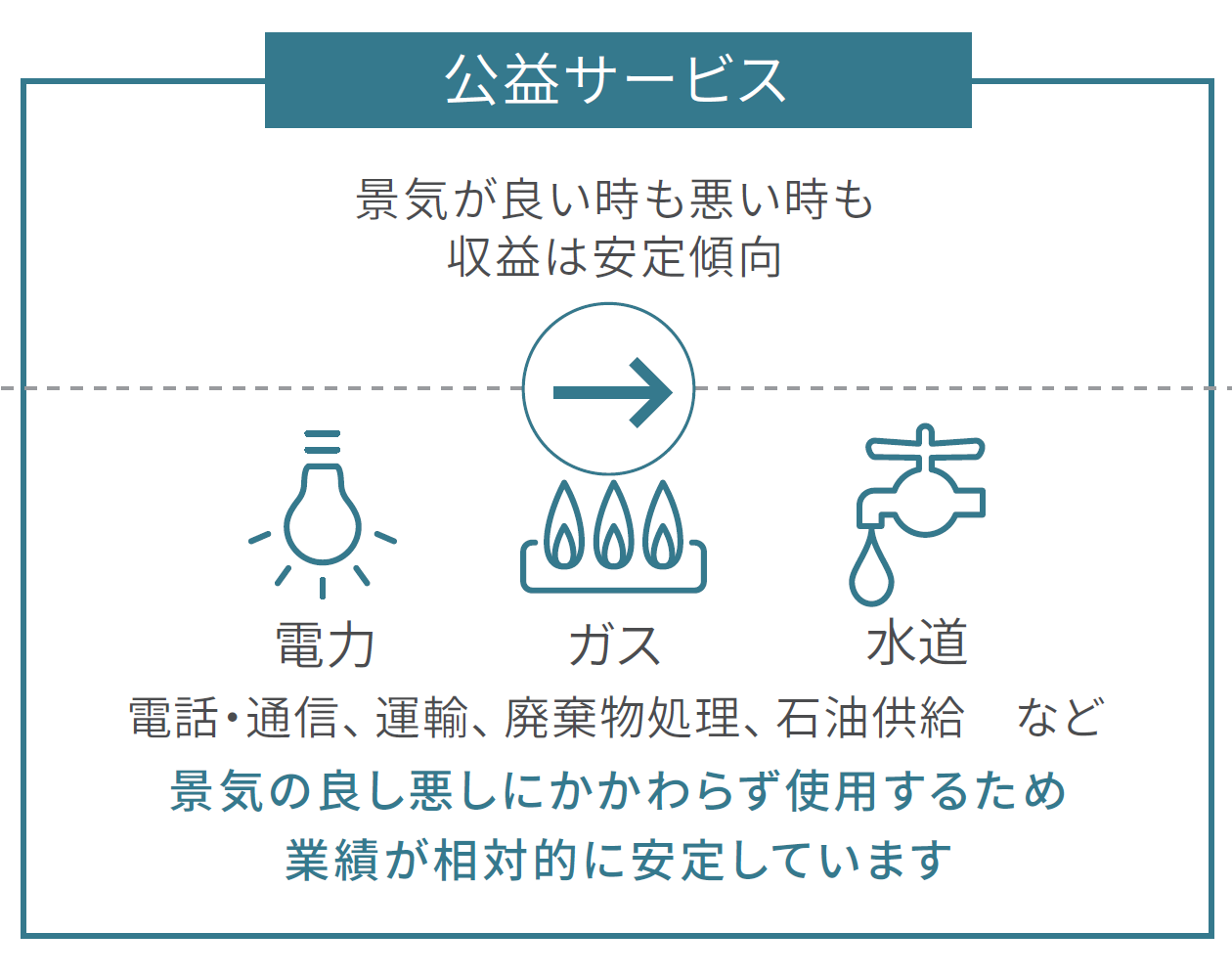 - 公益企業は電力・ガス・水道などの日常生活に不可欠な公益サービスを提供しているため、 景気の良し悪しにかかわらず、収益基盤は相対的に安定しています。
