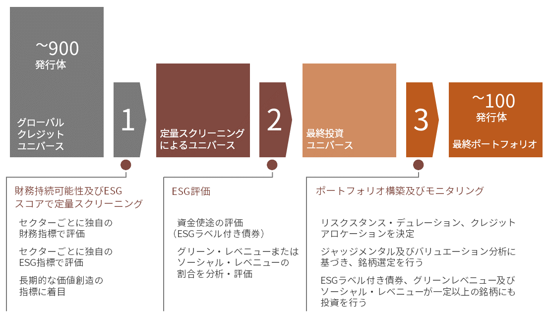銘柄選定においては、企業の財務持続可能性やESGスコアなどに加え、ESGラベル付き債券、グリーン・レベニュー及びソーシャル・レベニューなどを考慮した分析を行います。
