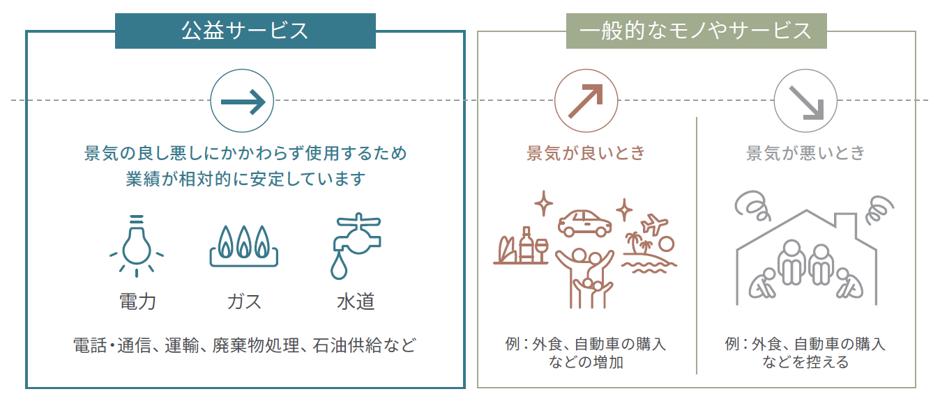 - 公益企業は電力・ガス・水道などの日常生活に不可欠な公益サービスを提供しているため、景気の良し悪しにかかわらず、収益基盤は相対的に安定しています。