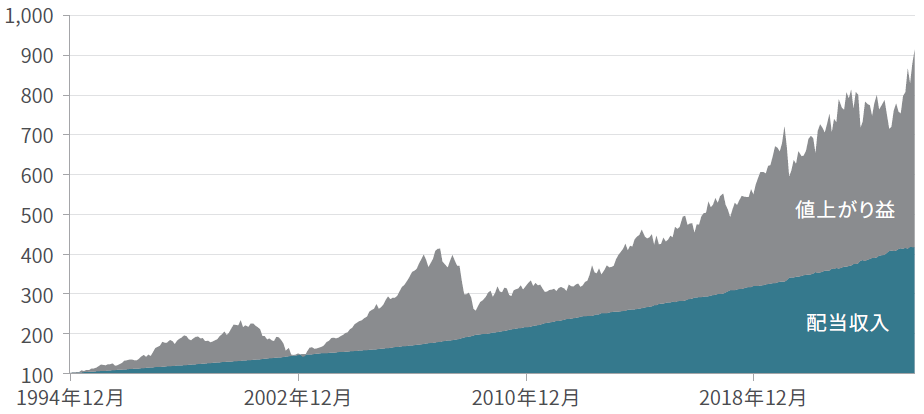 ※配当金再投資分は配当収入と値上がり益に按分、投資収益は現地通貨ベース、再投資ベース ※上記は株価指数のものであり、特定のファンドの運用実績ではありません。したがって、ファンドでかかる信託報酬等は考慮されていません。※データの出所等はページ下部をご覧ください。