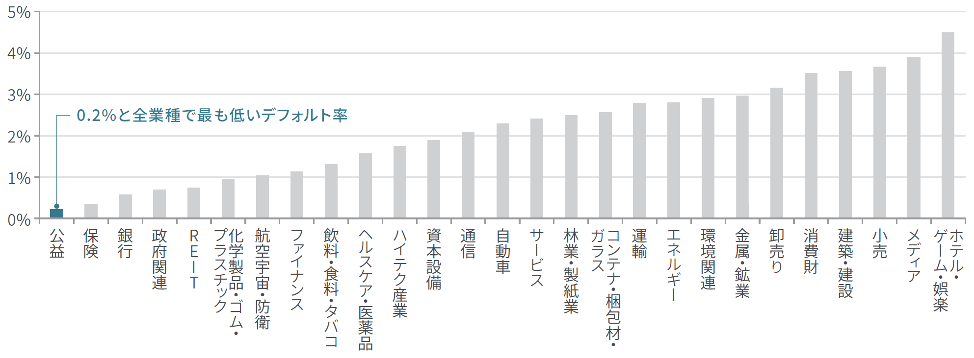 - 公益企業はデフォルト(債務不履行)率が相対的に低い傾向にあります。先行き不透明な環境において、事業の安定性は注目ポイントのひとつです。