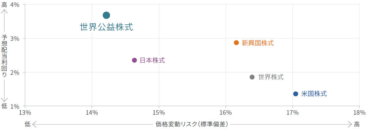 - 世界公益株式の予想配当利回りは、下図の各資産と比較して魅力的な水準にあります。