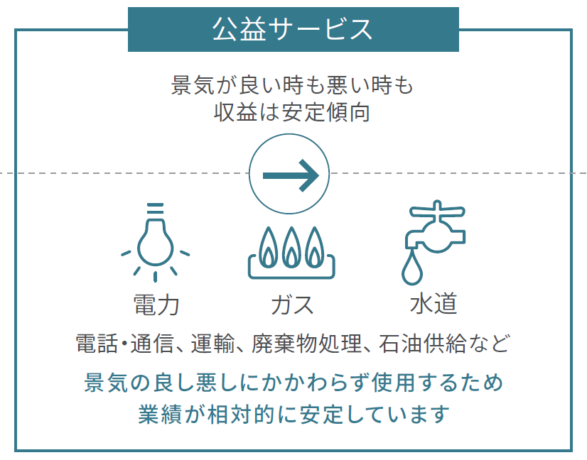- 公益企業は電力・ガス・水道などの日常生活に不可欠な公益サービスを提供しているため、景気の良し悪しにかかわらず、収益基盤は相対的に安定しています。一方、一般的なモノやサービスを提供する企業は景気動向の影響を受けやすい傾向があります。