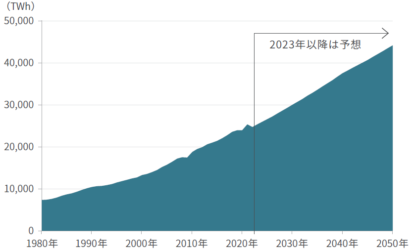※1980年~2022年は実績、2023年以降は国際エネルギー機関(IEA)の予想データ(発表政策ベース)を基に計算した2050年までの年平均成長率を用いて計算しています。