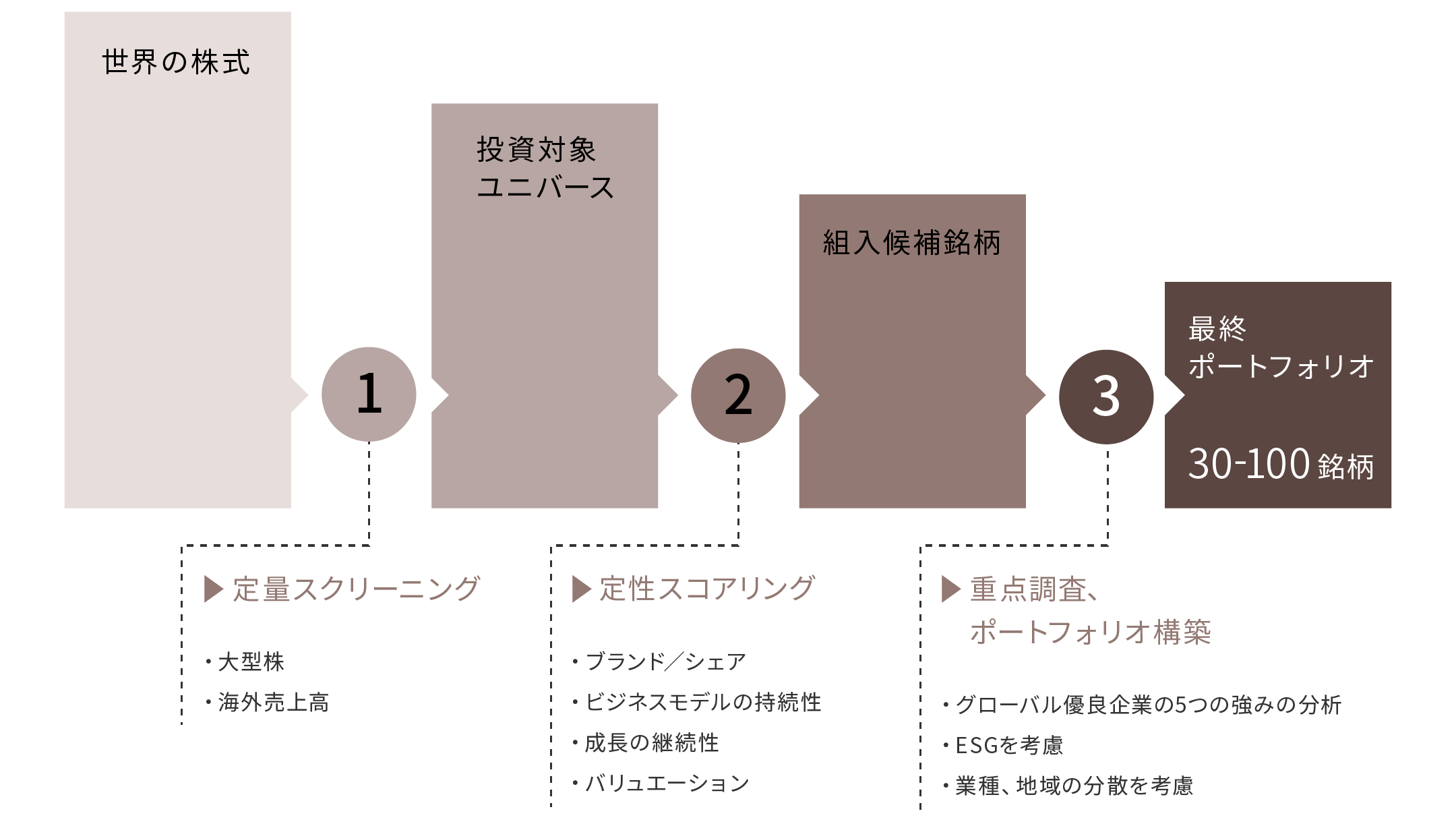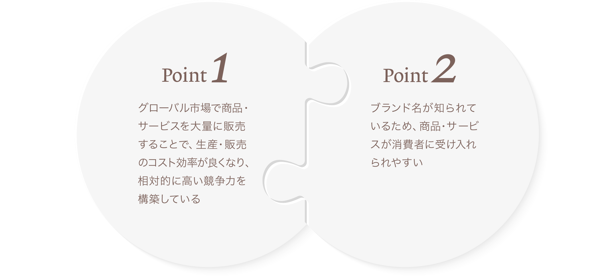 当ファンドは、世界的にブランド名が知られているうえに、強力なマーケティング・販売網を構築していることにより、高い競争優位性をもつグローバル優良企業の株式に投資します。