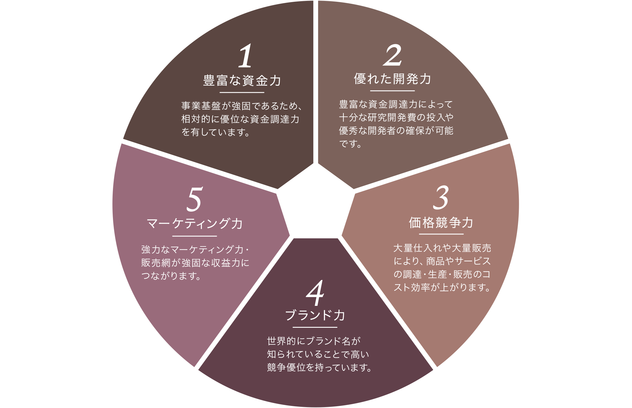 世界の株式を投資対象とし、ピクテ独自の定量分析および定性分析を行い、高い競争優位性をもつグローバル優良企業が持つ5つの強みに着目し、ポートフォリオを構築します。