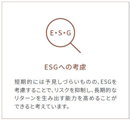 当ファンドでは、特性の異なる資産を複数組合わせることで、ポートフォリオ全体の値動きを安定化させるアセット・アロケーション戦略を採用していますが、同時にESGに注目した投資銘柄の選定を行います。