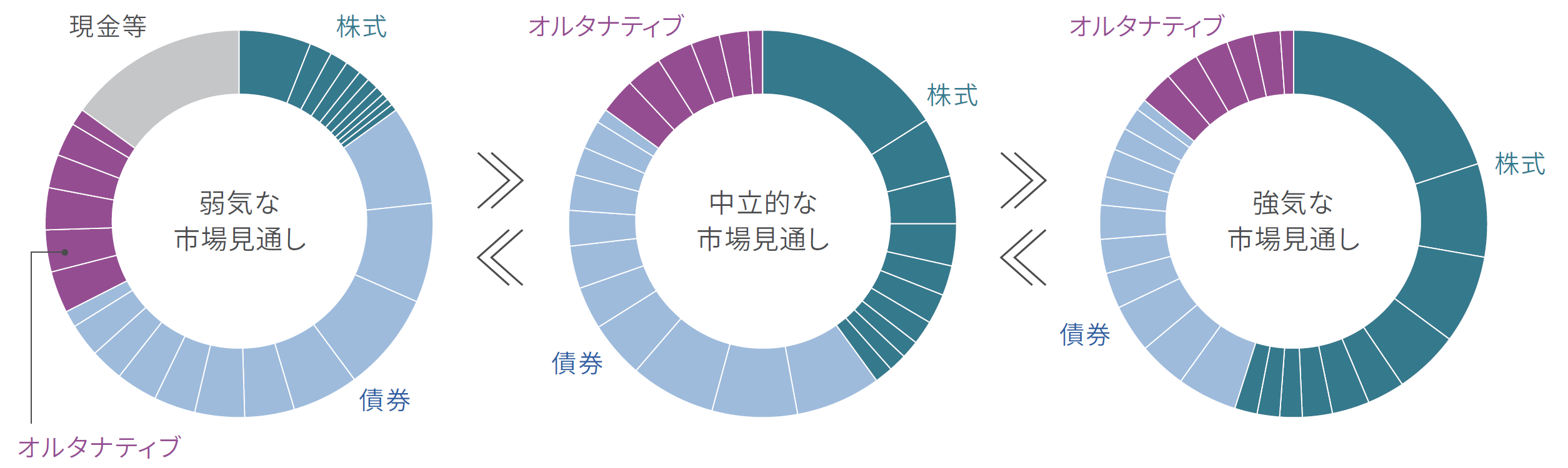 各資産の配分は、資産毎のリターンとリスクの見通しをもとに市場環境に応じて機動的に変更します。また、為替変動リスクも市場環境に応じてファンド全体でコントロールします。