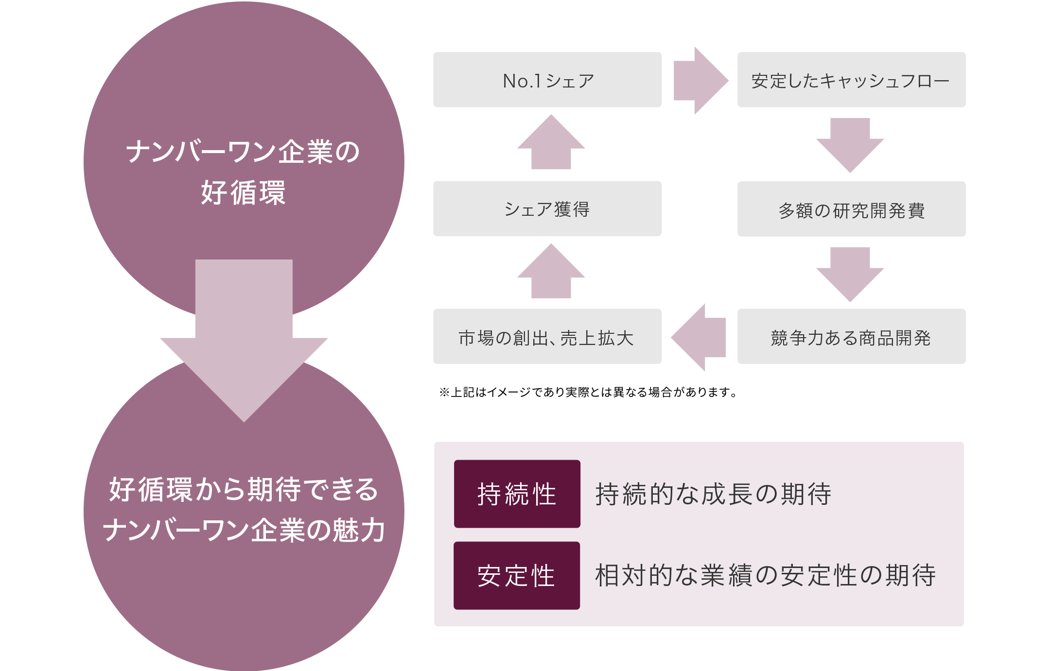 ナンバーワン企業の魅力は、特定の分野で他社を圧倒する参入障壁を築くことができ、価格支配力において高い競争優位性を有する点です。また、大企業の場合、規模の利益を活かせるため、コスト効率を改善し、相対的に高い競争力を構築することが可能です。