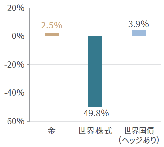 金、世界株式、世界国債(ヘッジあり)のパフォーマンス推移および市場混乱時の騰落率