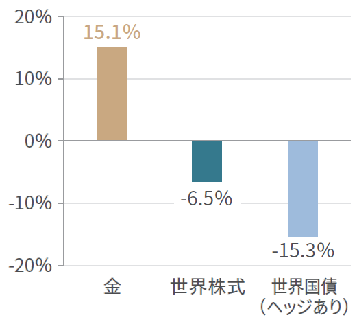 ※金:ロンドン市場金価格(円換算)、世界株式:MSCI全世界株価指数(配当込み、円換算)、世界国債(ヘッジあり):FTSE世界国債指数(円ヘッジ)