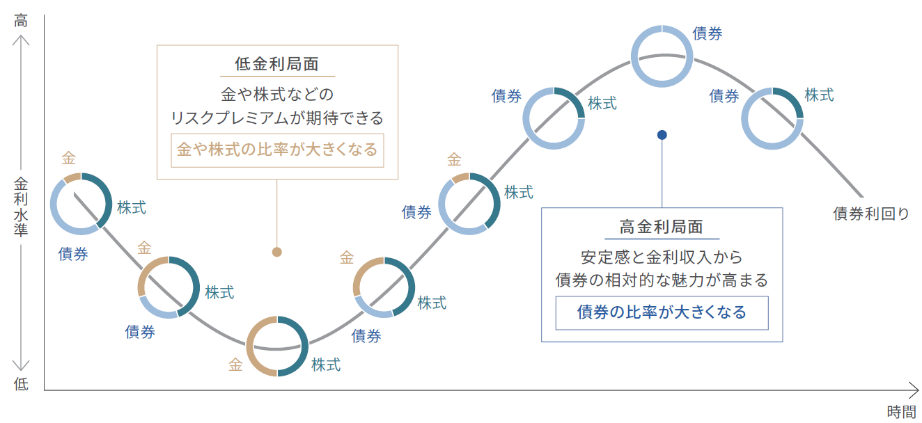 世界の市場環境に応じて魅力的なリスクプレミアムが期待できる資産を選定し、配分比率の決定を行います