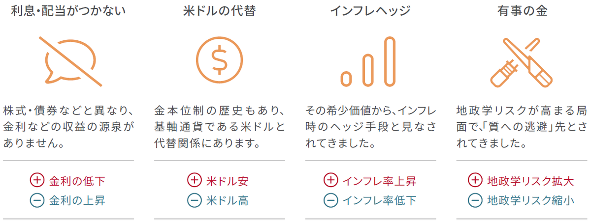• 株式や債券などとは異なる値動きをする傾向があり、安全資産としての魅力がある。