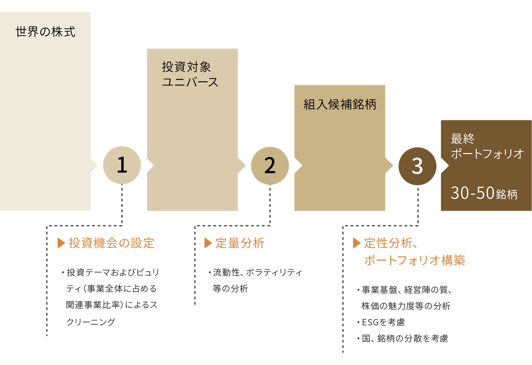 ピクテ独自の「ピュリティ(関連事業比率)」を重視した分析を行います。事業全体に占めるプレミアム・ブランド関連事業比率を重視したスクリーニングで、プレミアム・ブランド関連市場の長期的な成長を享受するポートフォリオを目指します。