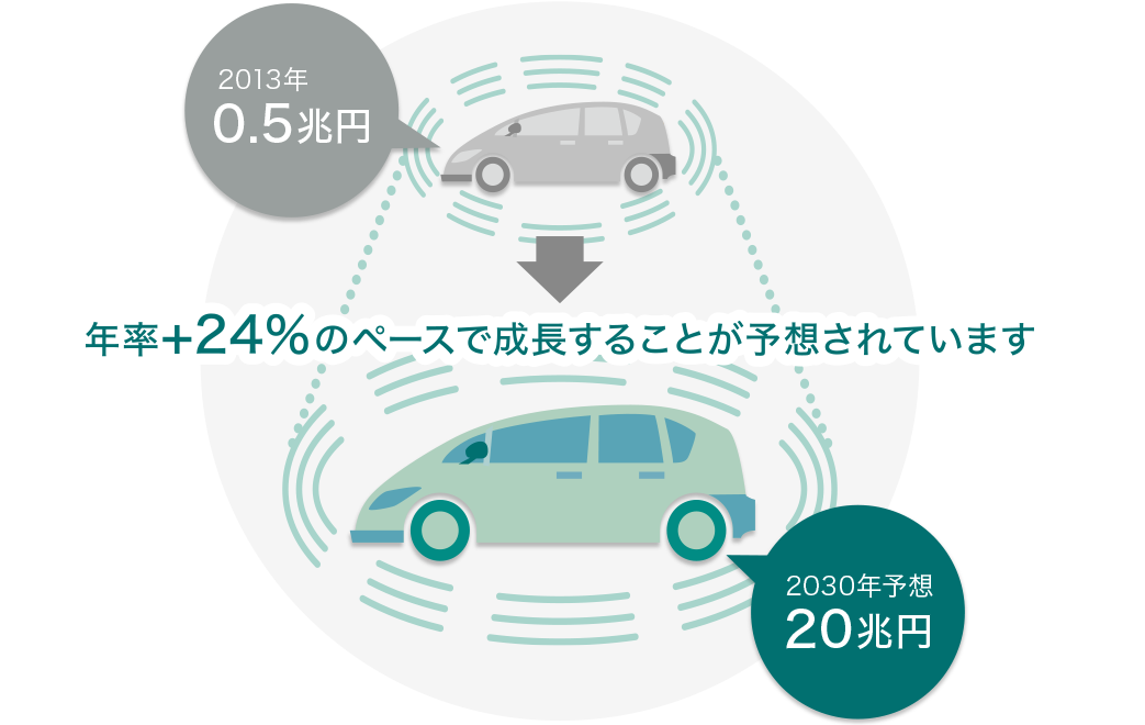 これまでのシートベルトやエアバッグなどの安全装置(パッシブセーフティ)に加えて、事故などの可能性を事前に検知し回避する「先進運転支援システム」などの技術(アクティブセーフティ)は、技術革新とともに急成長している分野のひとつです。