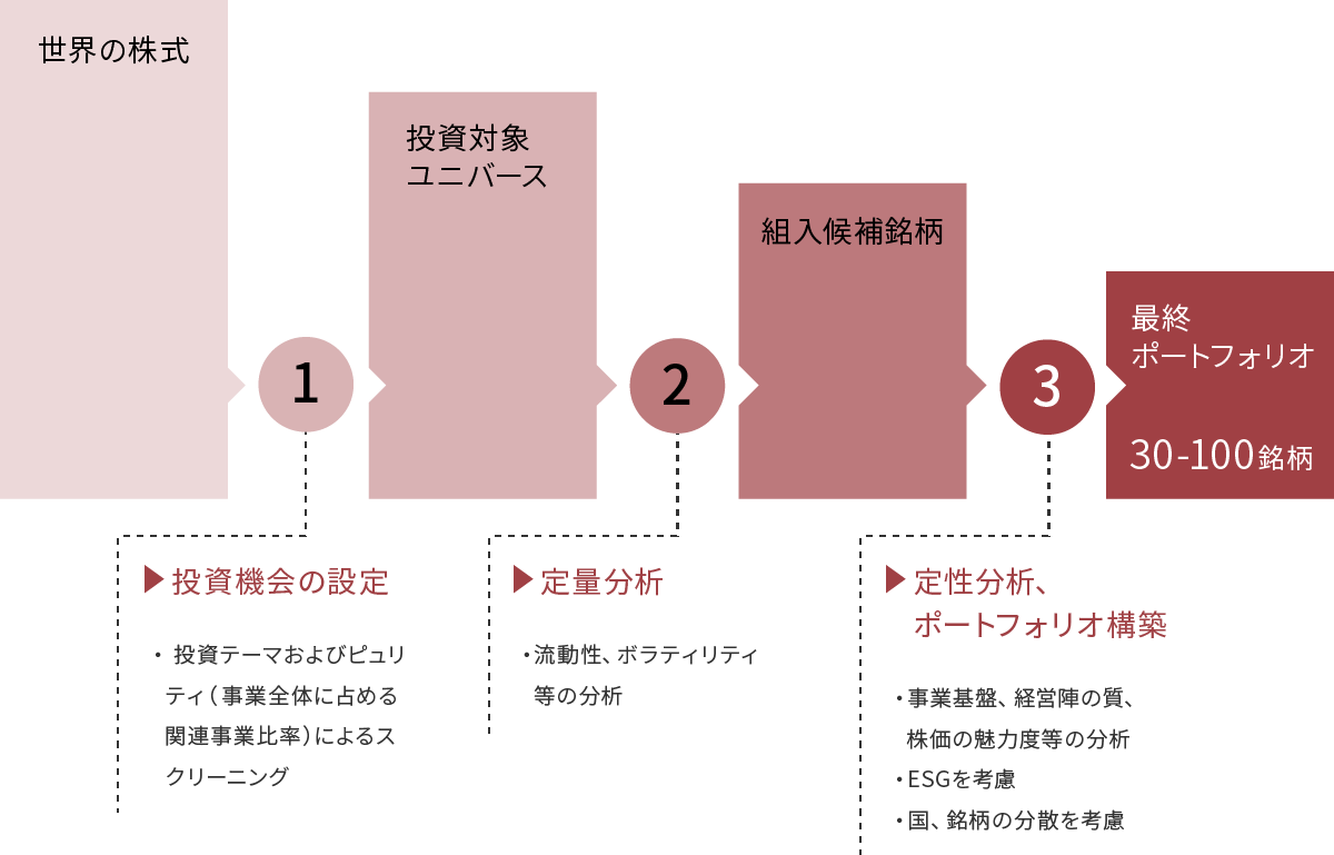 ※マザーファンドに投資するファミリーファンド方式で運用を行います。 ※マザーファンドの運用にあたっては、外国株式等の運用指図に関する権限を「ピクテ・アセット・マネジメント・エス・エイ」および「ピクテ・アセット・マネジメント・リミテッド」へ委託します。 ※特定の銘柄、国や通貨に集中せず分散投資を基本としリスク分散を図ります。 ※武器・軍事関連、原子力関連の製品・開発・検査・メンテナンス事業が売上高の5%以上を占める企業には投資を行いません。 ※資金動向、市況動向等によっては上記のような運用ができない場合があります。