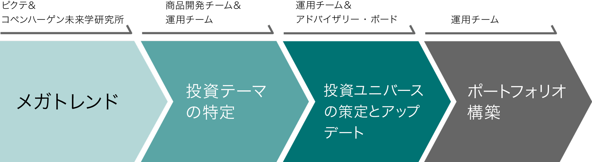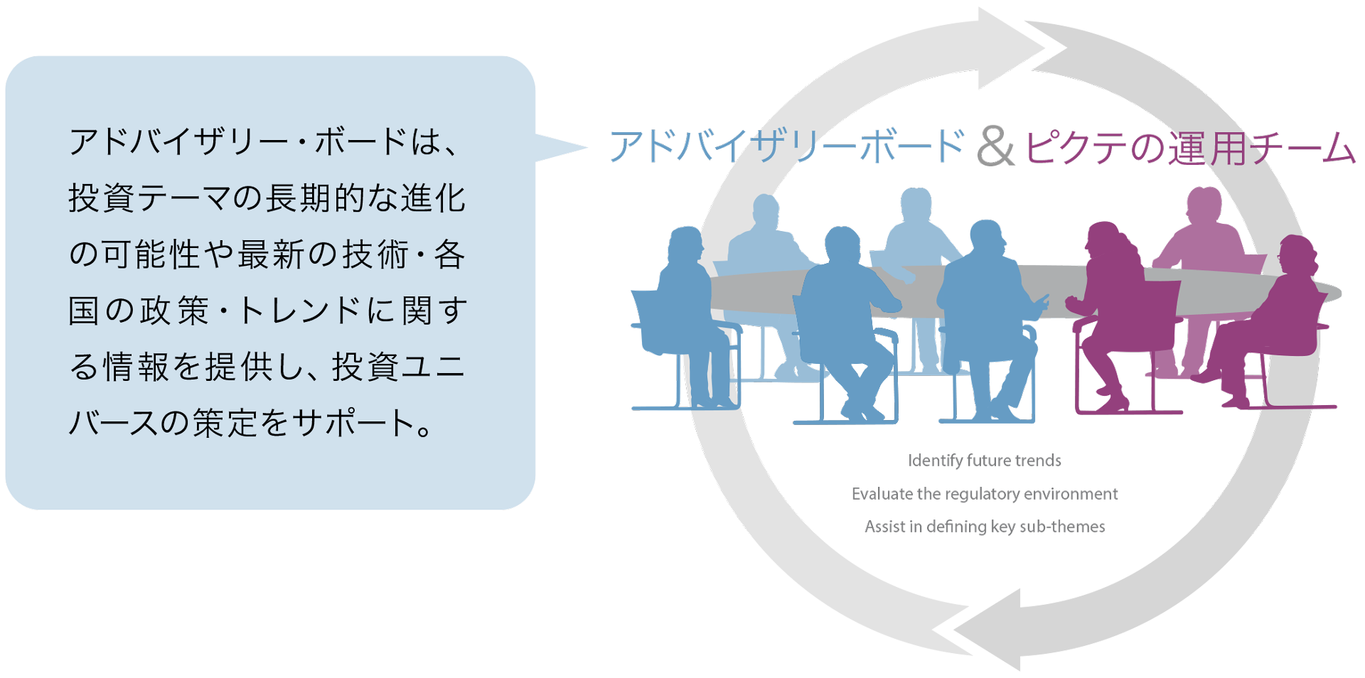 運用チームは、各投資テーマの専門知識を持った実務家と研究者からなるアドバイザリー・ボードからの情報に基づく将来予測を、投資ユニバースに反映させます。
