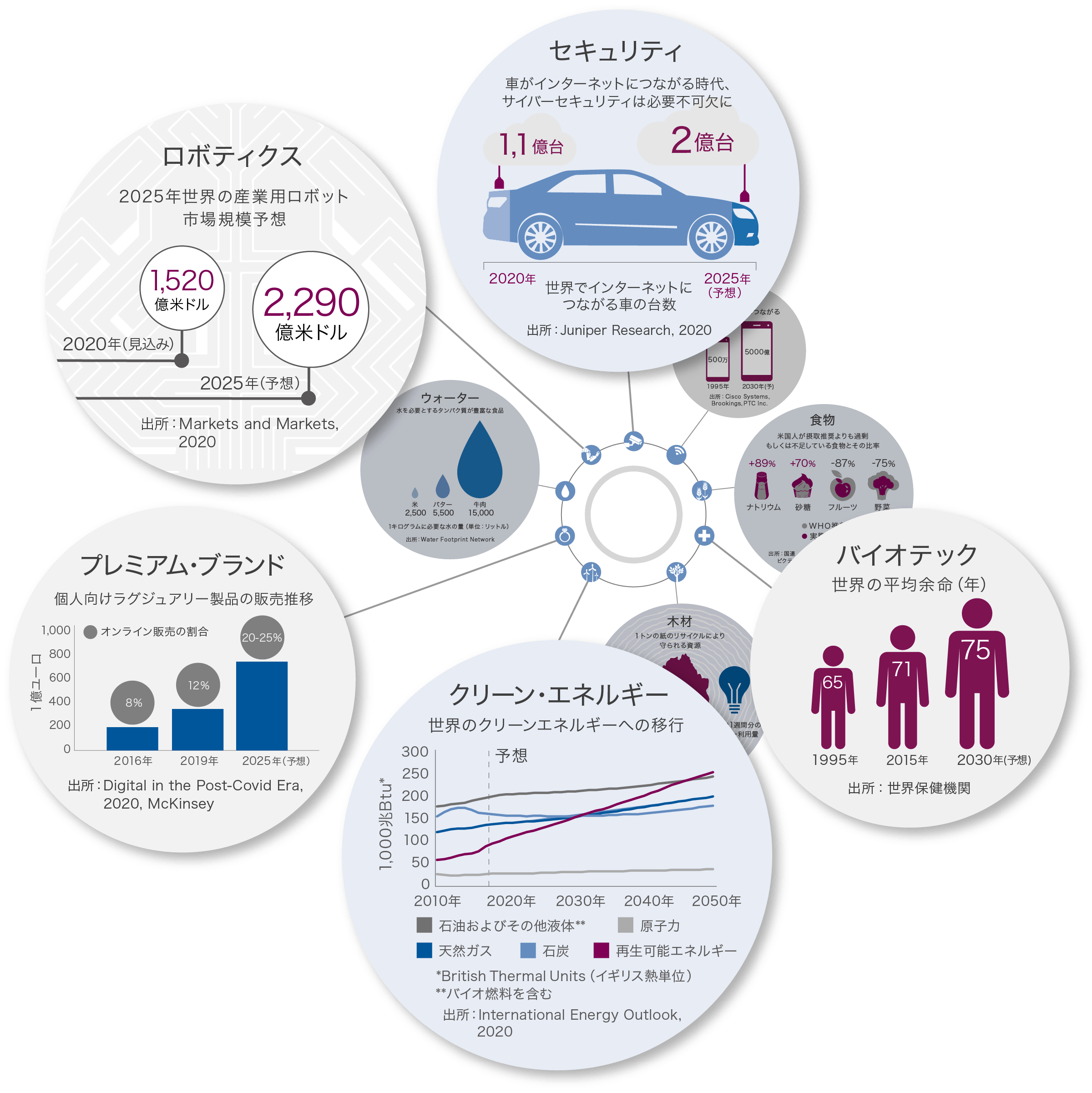 それぞれが長期的な社会的需要や発展につながり、今後の世界を形作る長期トレンドです。