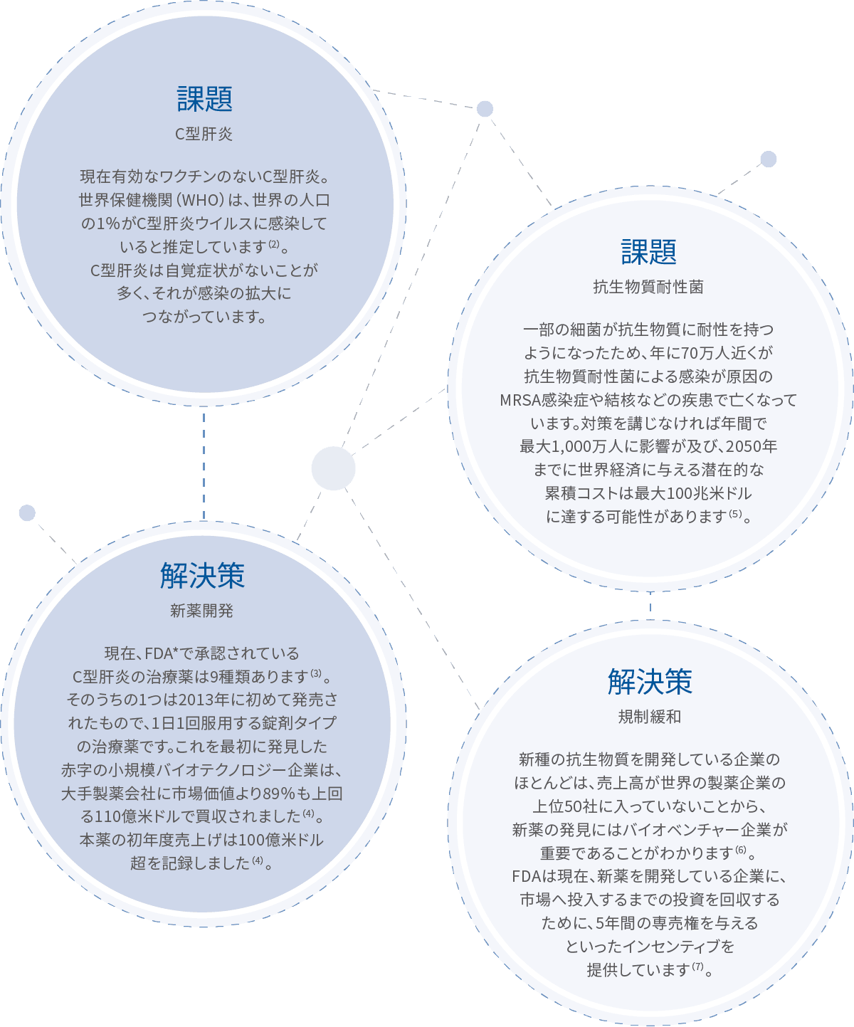 出所:(2) World Health Organization, 2019 (3) Hepatitis C University of Washington, January 2021 (4) Gilead Sciences, 2015 (5) World Health Organization, 2019 (6) The PEW Charitable Trusts, 2020 (7) Generating Antibiotic Incentives Now (GAIN) Exclusivity, US Food and Drud Administration website, May 2020 (8) The antibiotic is called teixobactin. Ling LL, Schneider T, Peoples AJ et al. A new antibiotic kills pathogens without detectable resistance. Nature 2015; 517: 455–9.