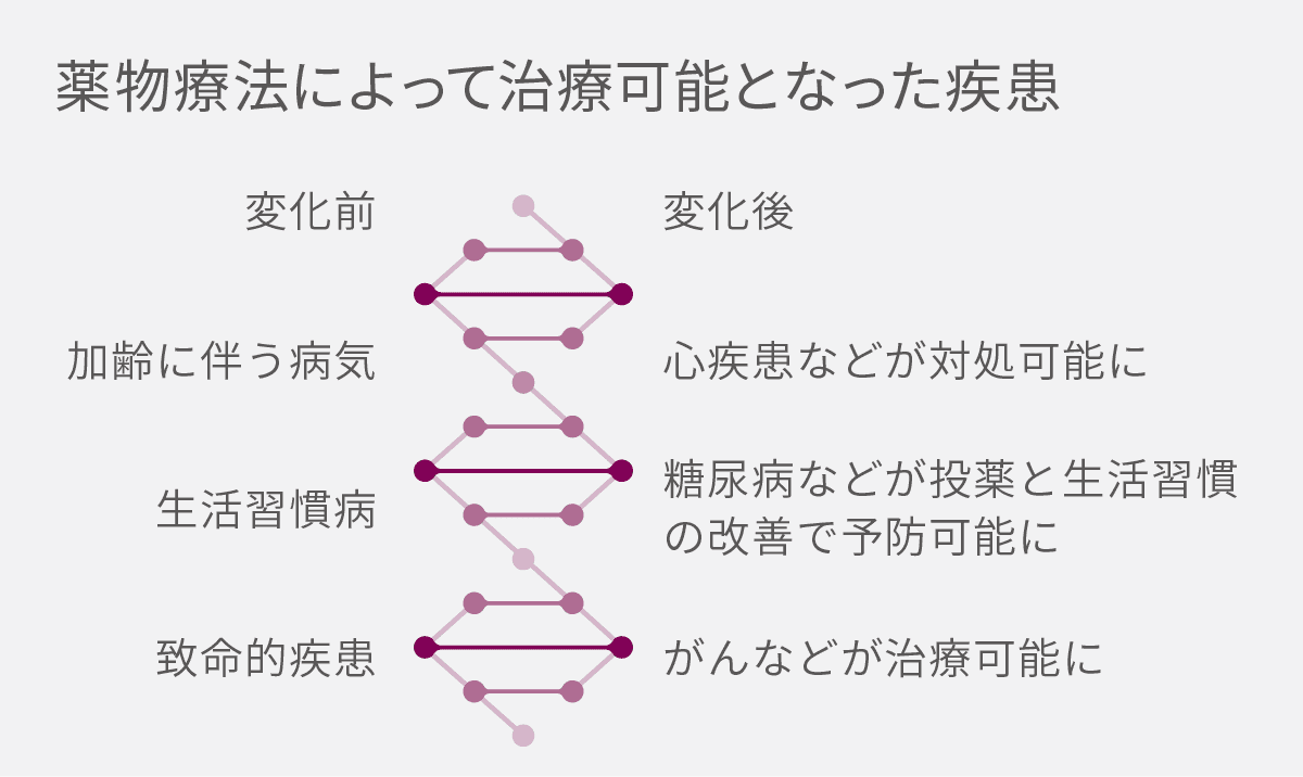 科学の進歩と病理学への理解の深まりは、薬に対する新たな行動メカニズムを生み出しました。これまで試行錯誤で行っていた薬の開発プロセスは、生物学的標的の知識に基づいた「ドラッグ・バイ・デザイン(計画的な医薬品開発)」へ移行しました。