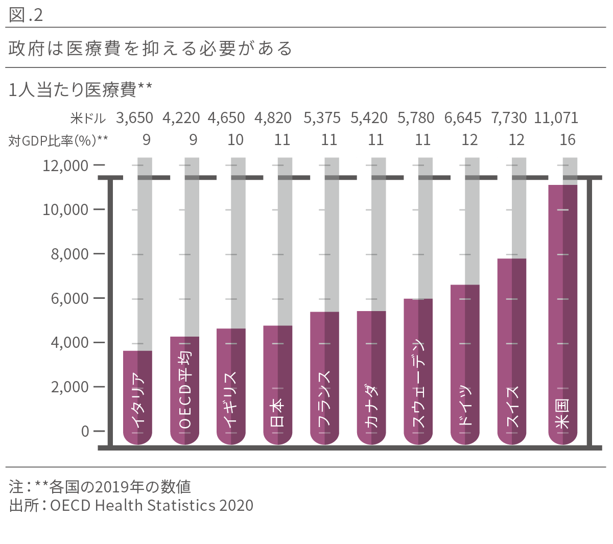例えば米国では平均的な先進諸国と比較し2倍以上の医療費を費やしています(図2参照)。コストを削減し、逼迫する医療制度を緩和する必要性は高まっており、より大きな革新が奨励されています。