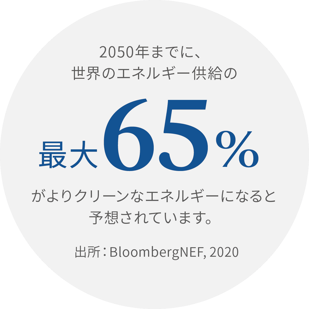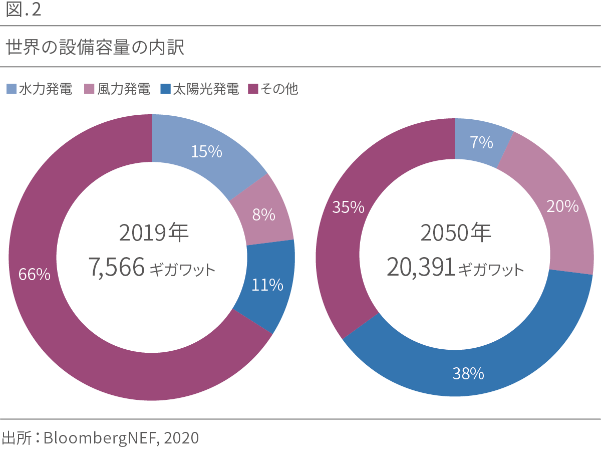 太陽光発電、風力発電、水力発電などの再生可能エネルギーは、先進国でも新興国でも、その重要性を増しています。図2が示すように、再生可能エネルギーは、2050年までに世界のエネルギー生産量の65%を占めると予想されています。