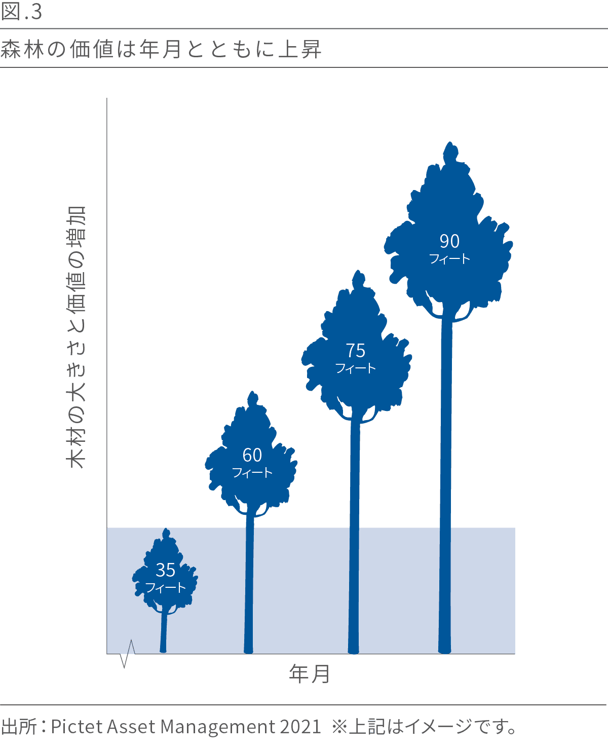 森林の生産性は世界経済の低迷の影響を受けにくいことから、ピクテは、森林地を魅力的な長期投資と考えています。需要が減速しても木は成長を続け、その価値を高めていきます(図3参照)。つまり、利益の獲得は先延ばしになるだけで、その頃には木の価値はさらに高くなる可能性があるということです。