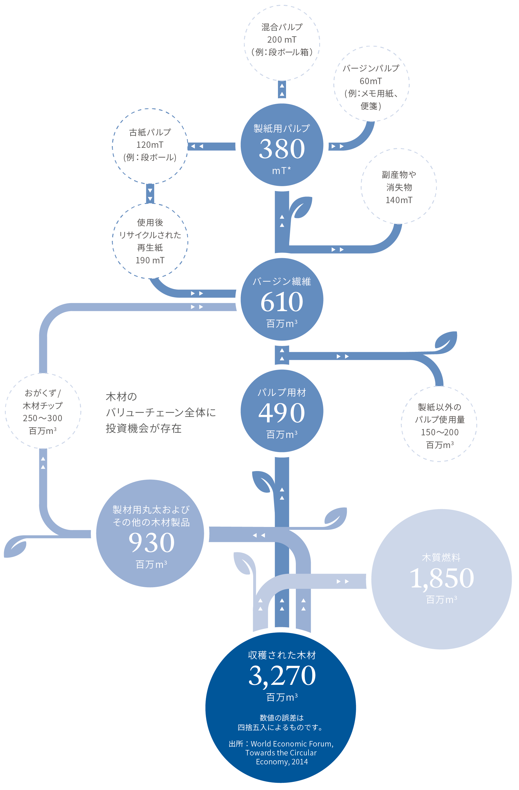 商品としての汎用性の高さから、木材という資源に対する需給はますます逼迫しています。世界的な人口の増加と消費の拡大を背景に、特にアジアでは消費に基づく経済が定着するなかで、紙製品や木材製品、衛生用品などの需要が増加すると予測されます。