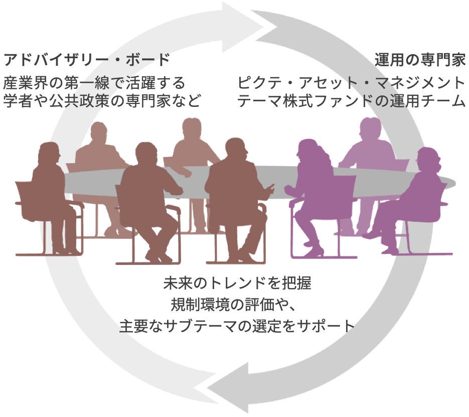 アドバイザリー・ボードは、投資判断に意見したり、ポートフォリオに組入れる銘柄を選定したりはしません。各投資テーマの重要な事柄を整理したり、幅広い視点を共有することで、運用チームをサポートします。