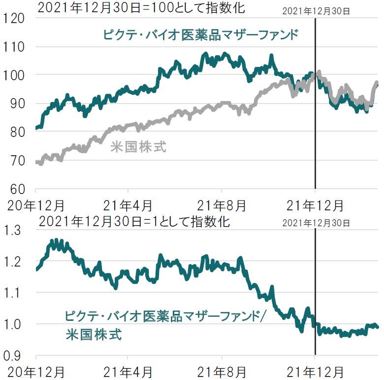 図表1:ピクテ・バイオ医薬品マザーファンドと米国株式の推移(上)と相対パフォーマンス(下)