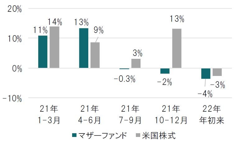 図表2:ピクテ・バイオ医薬品マザーファンドと米国株式の四半期ごとの騰落率