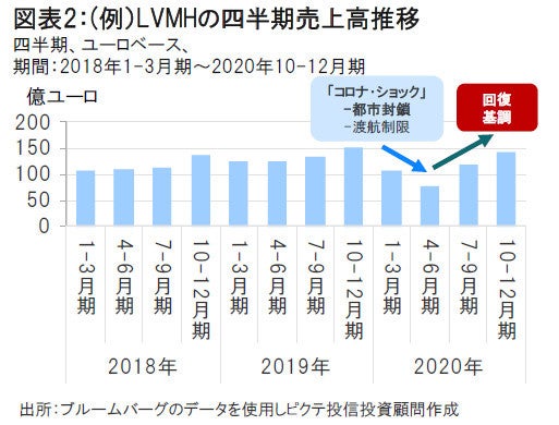 実際に、「リベンジ消費」の動きは既にみられはじめています。例えば、「ルイ・ヴィトン」でおなじみのLVMHモエ ヘネシー・ルイ ヴィトンの四半期ごとの売上高推移をみると、2020年前半は確かに厳しい状況でしたが、年後半から徐々に回復に向かっています。特に、経済がV字回復に向かう中国の人々が購入を増やしていることがけん引しました。
