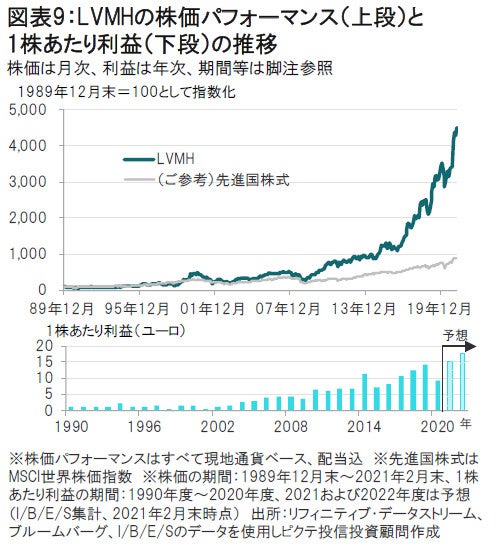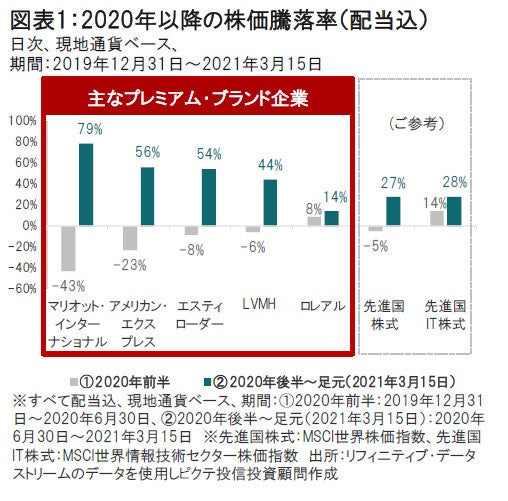 2020年後半以降、景気回復期待に加えて、新型コロナウイルスのワクチン接種が開始・拡大する中で、これまで「ステイ・ホーム」で自粛を強いられてきた人々の消費意欲が爆発し、特に高額商品では「リベンジ消費」が拡大するとの期待が高まっています。こうしたことは、プレミアム・ブランド企業の株価上昇の一因と考えられます。