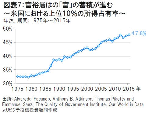 世界的に富裕層の「富」の蓄積がすすんでいます。米国の例をみると、所得上位10%の層が米国の所得全体に占める割合は年々上昇しています。こうした富裕層は、プレミアム・ブランド企業にとって「固定客」的な存在であり、富裕層の消費パワーが健在であることは、プレミアム・ブランド需要の下支えとなると期待されます。