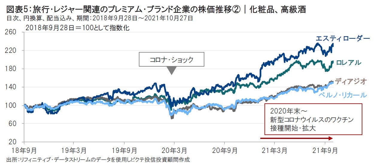 また、化粧品や高級酒を手がけるプレミアム・ブランド企業にも恩恵がもたらされると期待されます。海外旅行需要の回復は、化粧品や高級酒などの免税品販売の回復につながるためです。また、レストランやバーの営業再開・制限緩和に加えて、結婚式や各種パーティーといったソーシャル・イベントの開催が復活することで、メイクアップをして外出する機会、高級酒を楽しむ機会が増えていくものと考えられます。