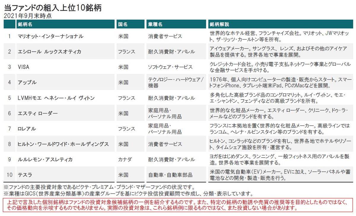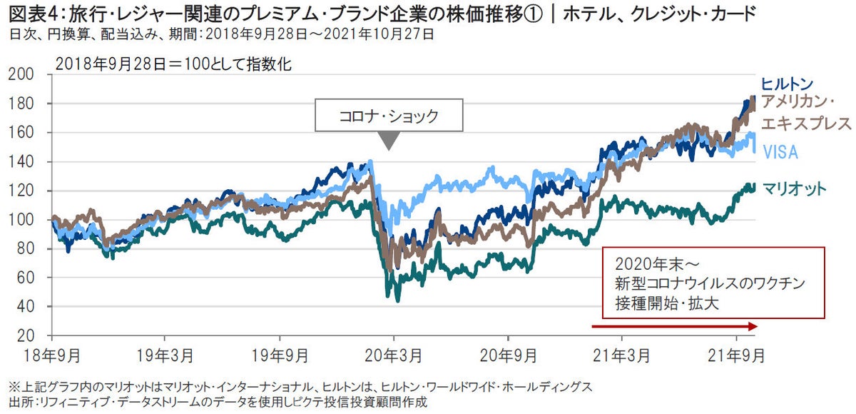 海外旅行需要が回復に向かうことで、ホテルやクレジット・カードなどのプレミアム・ブランド企業の業績も改善が期待されます。2021年8月の中国政府からの「共同富裕」戦略発表時点でも、これらの企業の株価は概ね底堅く推移しました。