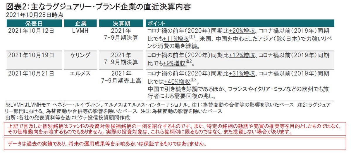しかし、2021年10月以降、複数のラグジュアリー・ブランド企業から、良好な直近四半期決算が発表されています。こうしたことが力強い追い風となり、ラグジュアリー・ブランド企業の株価は反発がみられました。