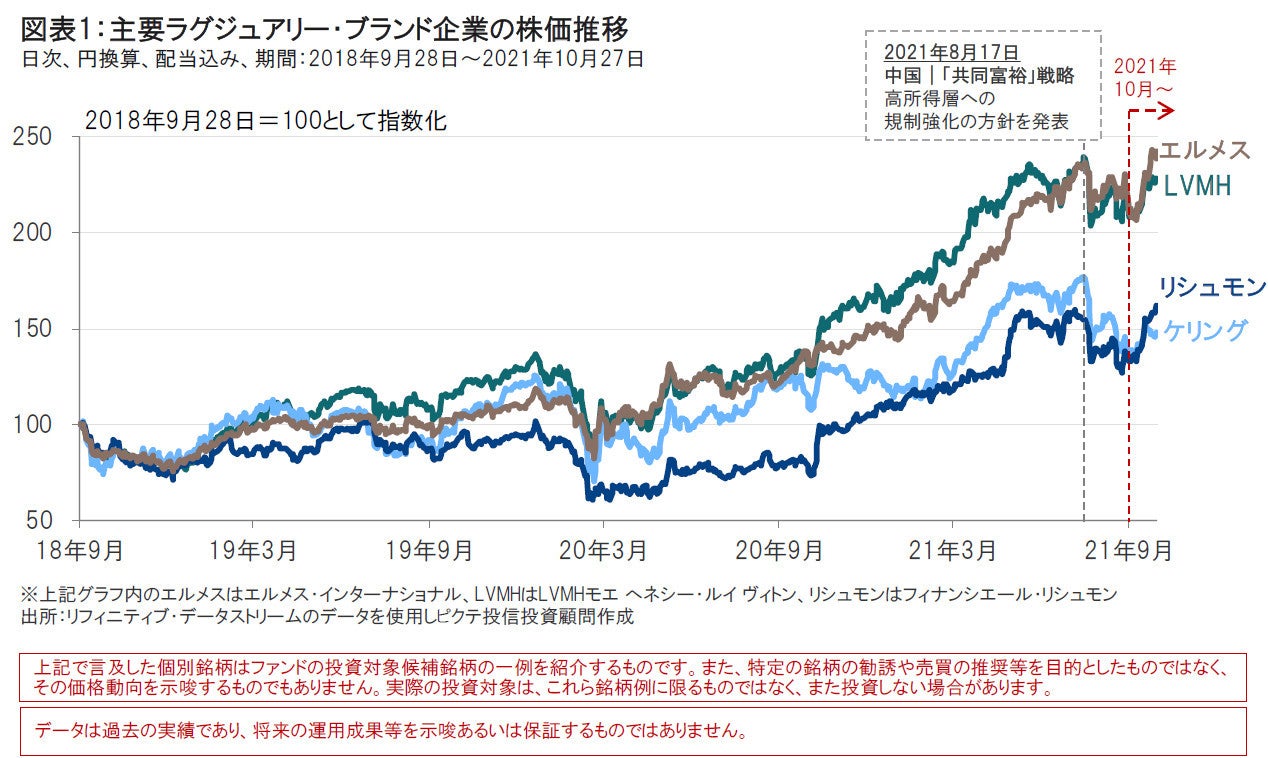 2021年8月17日に中国政府は、「高所得の規制・調整を強化するとともに、法に沿った所得を守り、過度な所得を合理的に調整し、高所得層と企業に社会への還元を増やすよう促す」方針(いわゆる「共同富裕」戦略)を発表しました。これを受けて、富裕層への課税強化やその他の締め付けが導入される可能性や、それによってプレミアム・ブランド商品・サービスの需要にマイナスの影響があると懸念する見方が強まりました。特に、ラグジュアリー・ブランド企業の株価は、相対的に大きくマイナスの影響を受けました。