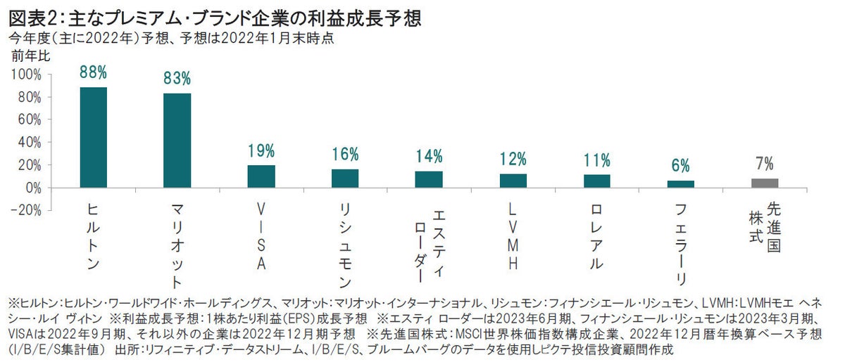 プレミアム・ブランド企業の株価は、2020年に続いて2021年も大きく上昇してきました。2022年年初以降、米国をはじめとした主要国の金融政策引き締め観測が高まり、成長株への売り圧力が強まる中で、プレミアム・ブランド企業の株価もマイナスの影響を受けています。しかし、経済正常化は依然として道半ばであり、経済正常化がさらに進むことがプレミアム・ブランド企業の利益成長を後押しするとの見通しに変わりがありません。