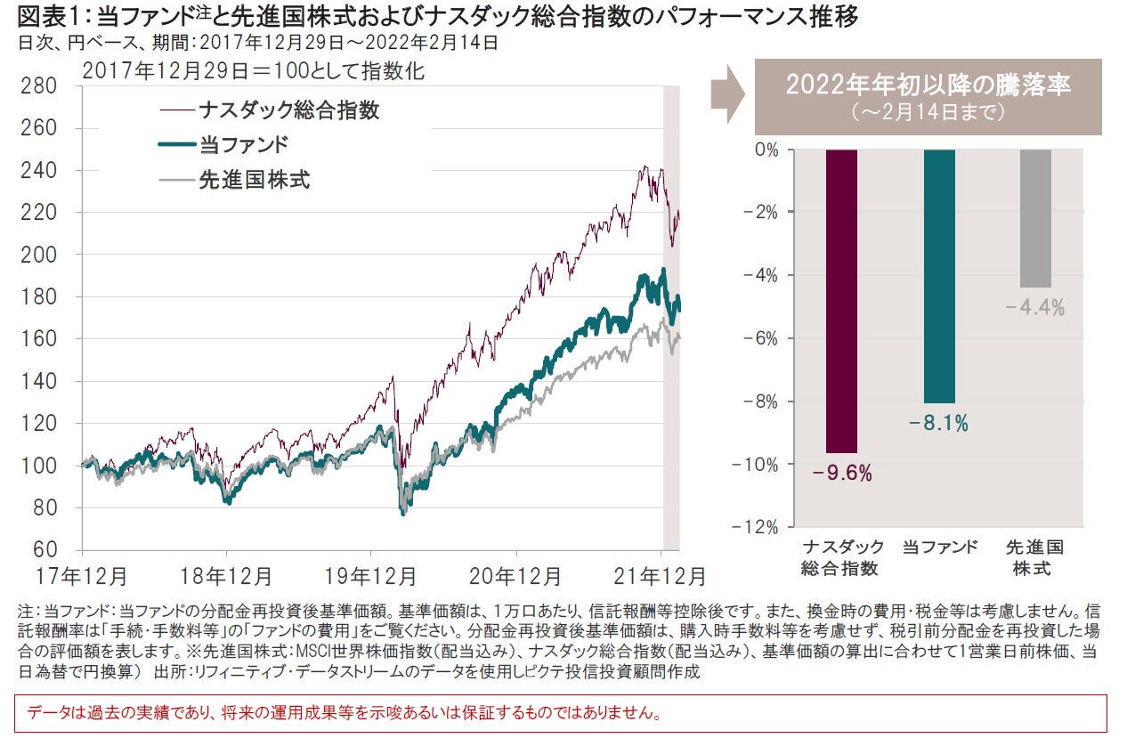 2022年年初以降は、インフレ懸念の高まりなどを背景に、米国をはじめとした主要国の金融政策の引き締め観測が高まり、金利が上昇する中で、これまで大きく株価が上昇し、バリュエーション(投資価値評価)水準が高まっていた成長株(代表例:図表1のナスダック総合指数)を中心に売り圧力が強まり、下落率が大きくなっています。こうした市場全体の流れから、プレミアム・ブランド企業の株価も下落し、当ファンドのパフォーマンスもマイナスの影響を受けています。