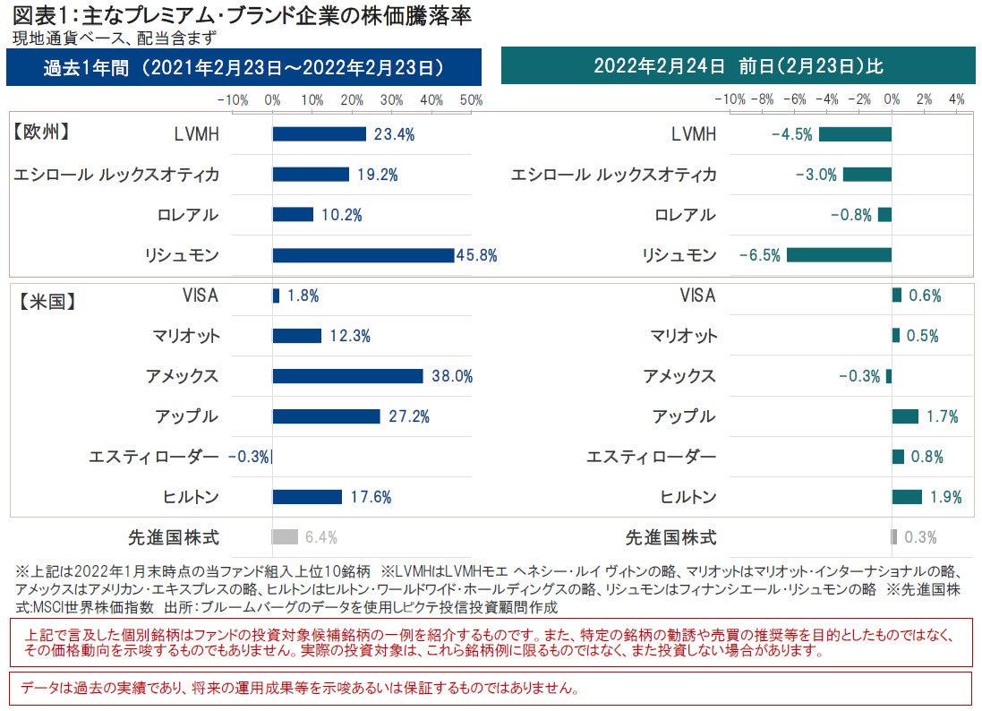 2022年2月24日、ロシアによるウクライナへの軍事侵攻が開始されたことを受けて、世界の株式市場はアジアや欧州を中心に下落し、不安定な動きとなりました。こうした流れの中で、当ファンドの投資先であるプレミアム・ブランド企業の株価も、欧州企業を中心に下落率が大きくなりました。当面は値動きが大きくなる懸念は残りますが、中長期的な成長性に加えて、足元のコロナ危機からの経済正常化から恩恵を受けるとの見方に変わりはありません。