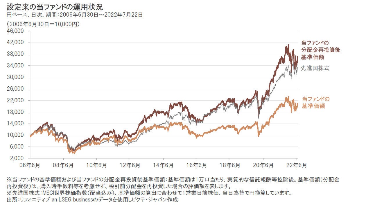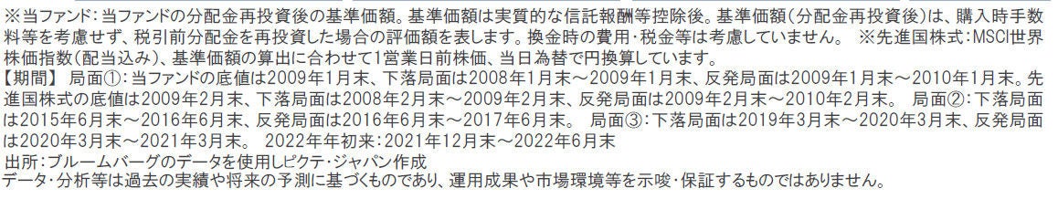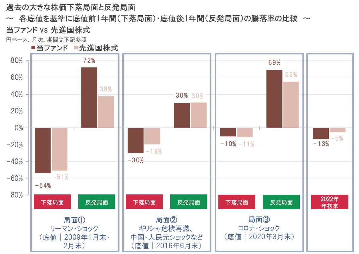 過去の実績では、株式市場の反発局面において、当ファンドの分配金再投資後の基準価額は投資先であるプレミアム・ブランド企業の株価が大きく上昇したことを受けて、力強く上昇してきました。リーマン・ショック後やコロナ・ショック後には先進国株式を上回る上昇率となりました。