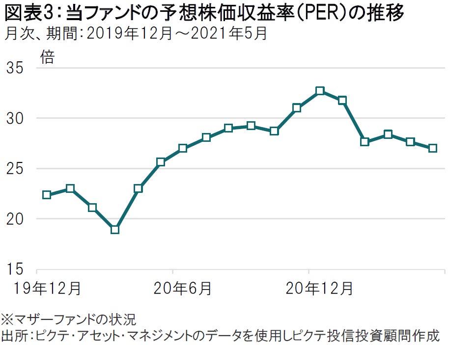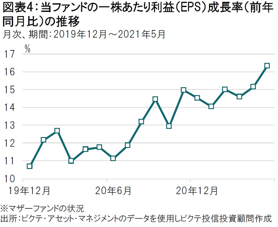 再生可能エネルギー関連銘柄への利益確定の動きやグロース株からバリュー株へのローテーションを経たことから、現在の当ファンドの投資対象のバリュエーションは、今後数年間に予想される成長の加速を考慮すると、魅力的な水準にあると考えます(図表4参照)。