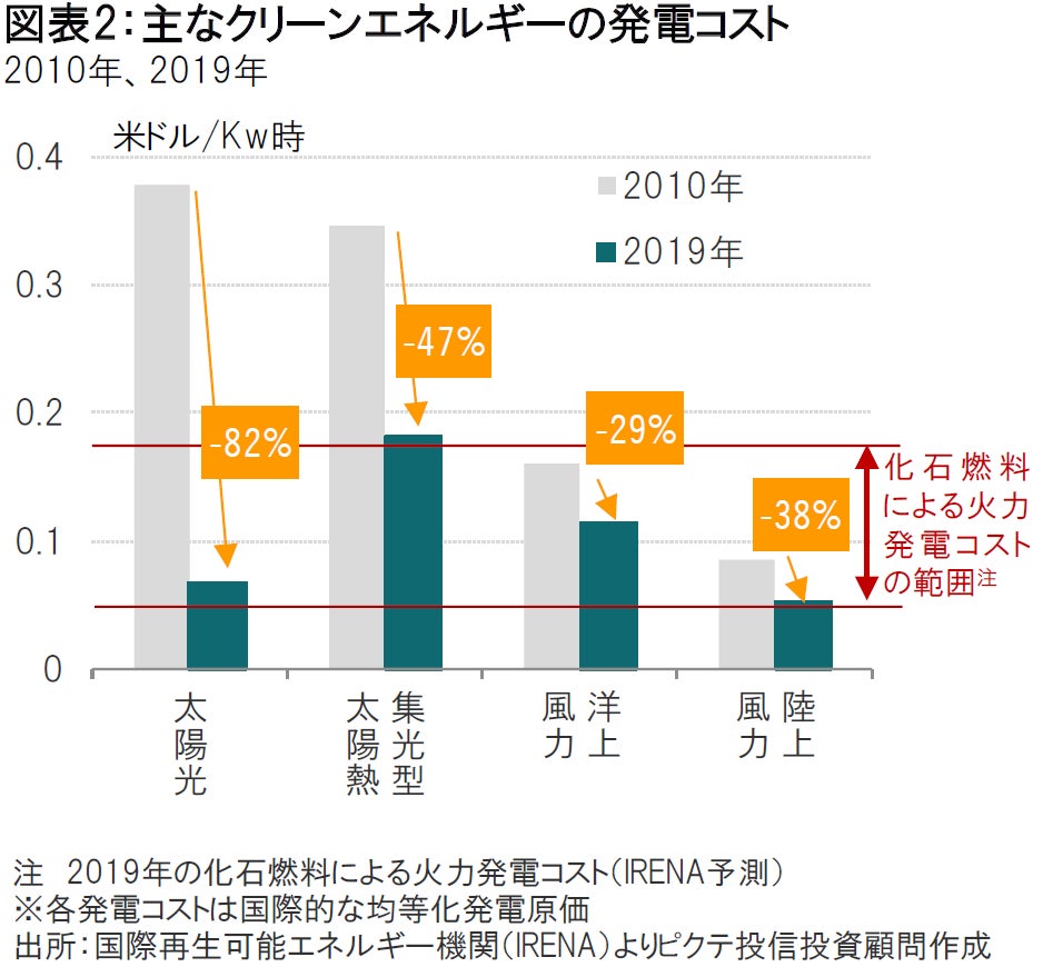 一部の再生可能エネルギーの開発企業にとっては、理論上、長期金利の上昇により借入金利が上昇することになりますが、発電コストが低下し導入が増えることで、ソーラーパネルやその他の関連コストが低下し、それを補うと考えます(図表2参照)。また今後、再生可能エネルギー関連のプロジェクトが増加し、プロジェクトのリスクが低いことが周知されると、借入コストが低下する可能性もあります。