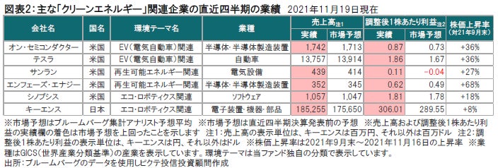 EV(電気自動車)関連で最も注目を集めている銘柄であるテスラ(米国)の2021年7-9月期の決算は、売上高は市場予想を小幅に下回ったものの、世界的な半導体不足やサプライチェーン問題がある中でも調整後1株あたり利益(EPS)は市場予想を上回り、同社の株価は上昇し、その他のEV関連の企業にも注目が集まりました(図表2参照)。他にも主な「クリーンエネルギー」関連企業の業績を見てみると、再生可能エネルギー関連のサンラン(米国)やエンフェーズ・エナジー(米国)、エコ・ロボティクス関連のシノプシス(米国)やキーエンス(日本)なども直近の四半期決算で売上高、調整後1株あたり利益ともに市場予想を上回る結果となり、これらの企業の株価の上昇をけん引する要因となりました。