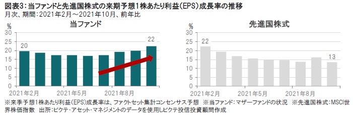 また、来期予想1株あたり利益(EPS)の成長率の推移をみると、先進国株式の来期予想EPS成長率は2021年前半に比べ低下している一方、当ファンドの投資企業については、夏以降、上昇基調にあります(図表3参照)。世界的に気候変動への取り組みが本格化する中、EVや再生可能エネルギーなど当ファンドが投資対象とする「クリーンエネルギー」関連企業の成長見通しが改善していることが株価にとってプラスとなっています。