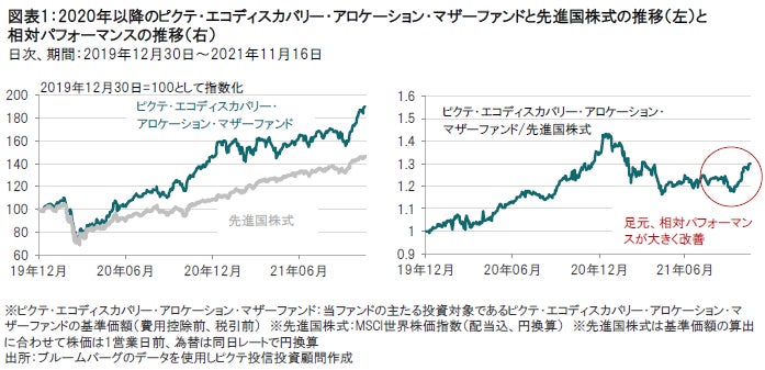 世界的に気候変動への注目が高まり、世界の株式市場が堅調に推移する中、「クリーンエネルギー」関連に注目した投資を行っているピクテ・エコディスカバリー・アロケーション・ファンド(当ファンド)のマザーファンドのパフォーマンスは、2020年3月末以降、世界の株式市場が堅調な動きとなる中、先進国株式を上回って推移しています(図表1左参照)。