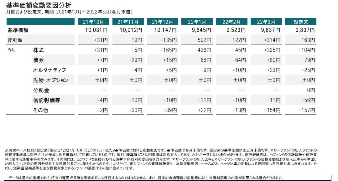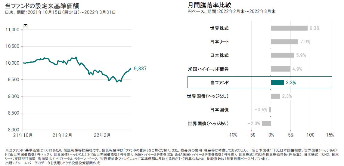世界的なインフレ懸念の一段の高まりに加えて、ロシア・ウクライナ情勢などが、引き続き世界の金融市場の不安定要因となりました。ただし、月後半に、ロシアとウクライナの停戦交渉への期待が高まったことなどから、株式市場は上昇しました。また、主要通貨に対して円安が進行しました。こうした市場環境下、当ファンドの2022年3月31日の基準価額は9,837円となり、前月末比で+314円(+3.3%)の上昇となりました。