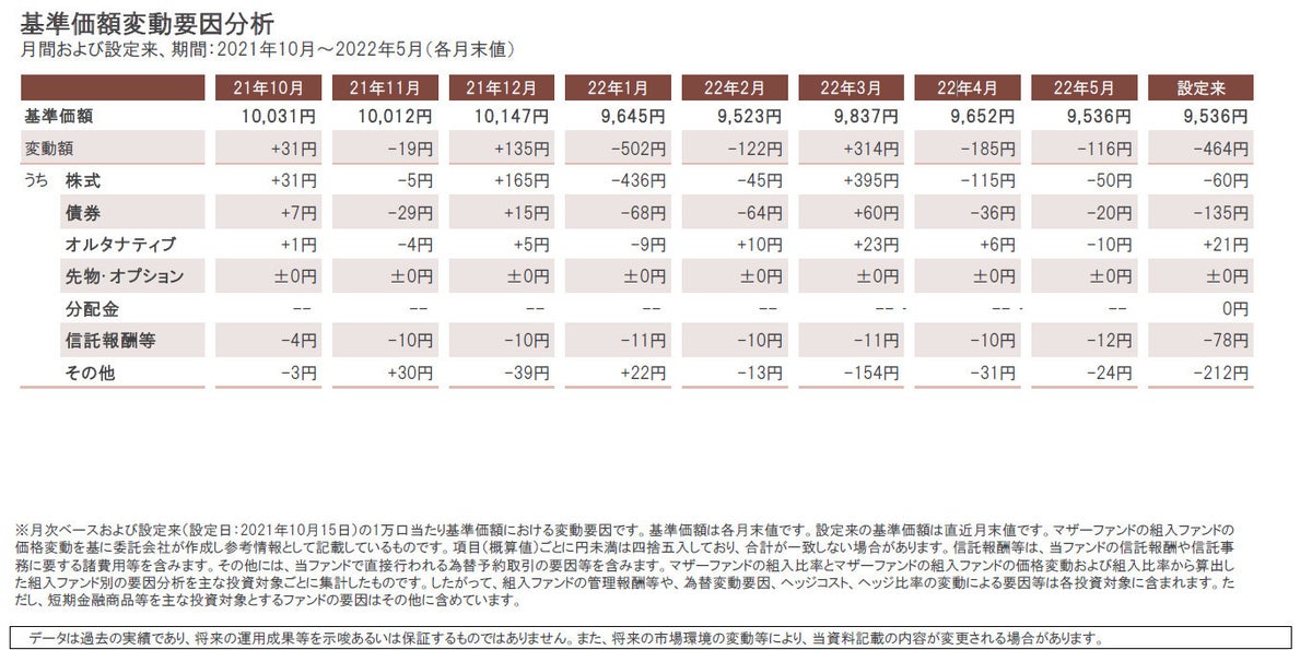 こうした市場環境下、当ファンドの2022年5月31日の基準価額は9,536円となり、前月末比で-116円(-1.2%)の下落となりました。